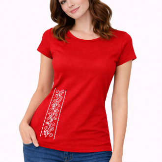 Women's T-shirt with embroidered folklore ornament. T-shirt is made of 100% cotton, tapered cut accentuating the feminine silhouette, silicone softener ensures flow and softness to the touch.