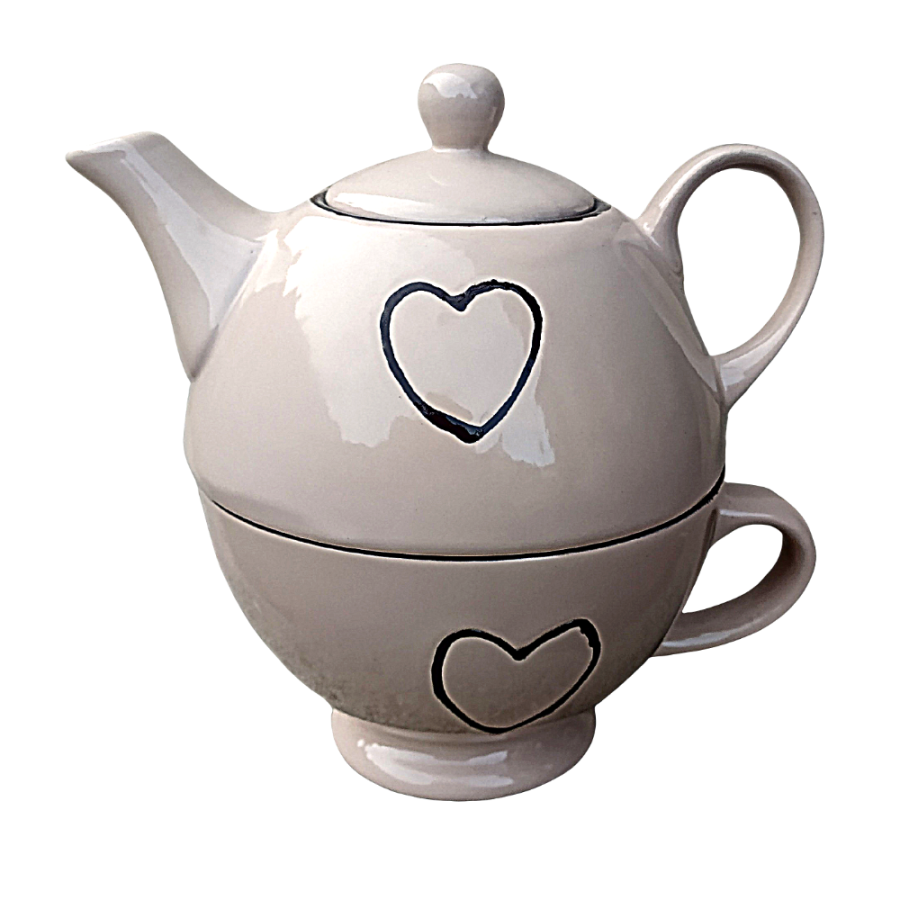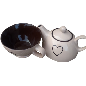 The tea set consists of a 0.4 l mug and a 0.43 l teapot, which fold into each other. Material: porcelain. . Dimensions: total height 16 cm, mug - dia. 12 cm.