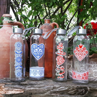 Trendy fľaša s folklórnym motívom.
