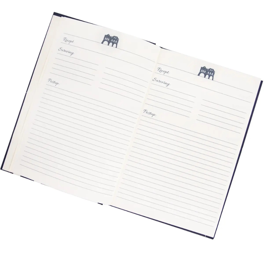 Dizajnová kniha na recepty z kolekcie DOMČEKY v tmavo modrej farbe, s rozmerom 14,5x21,5 cm, je doplnená drevenou vareškou. Má 180 predtlačených strán, kam si môžete zaznamenávať zaujímavé recepty.