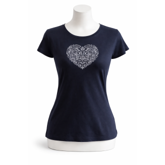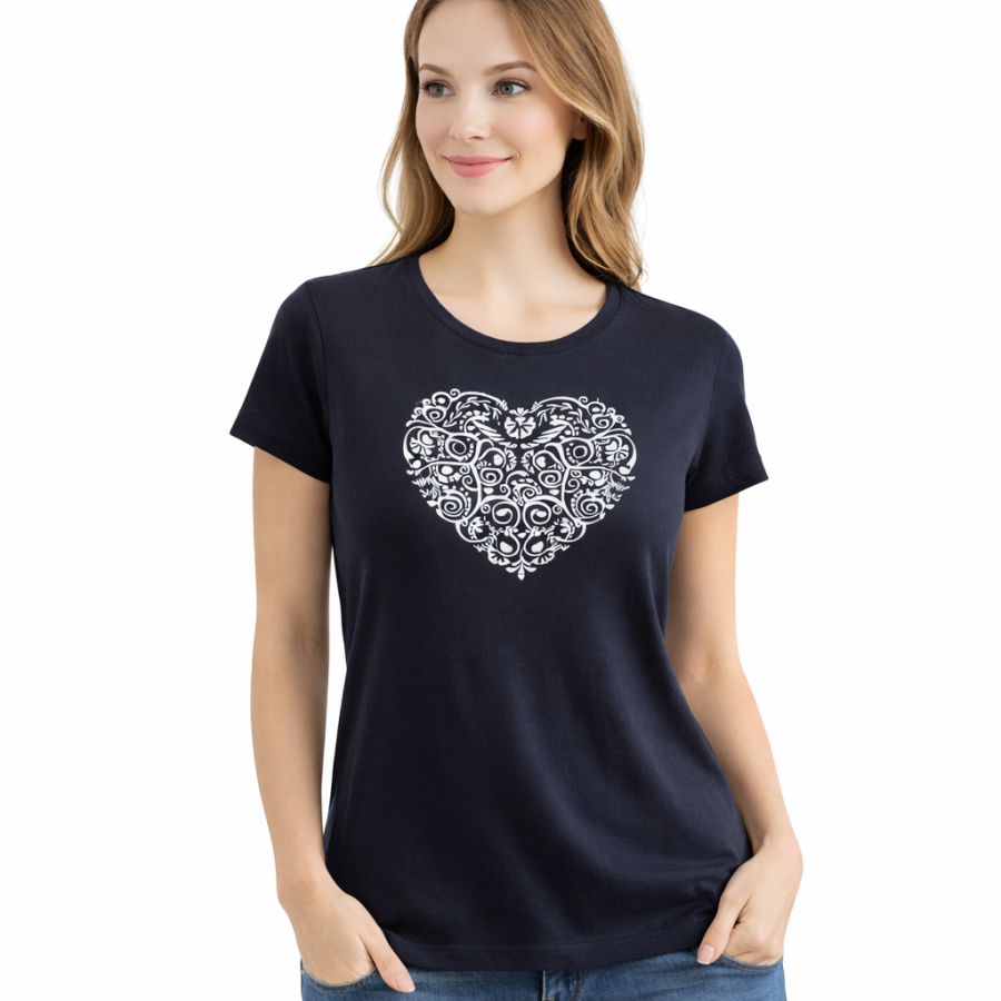 Štýlové dámske tričko v elegantnej tmavomodrej farbe zdobí jemné folklórne srdce s detailným ornamentom, ktoré dodáva tričku originálny a ženský vzhľad.