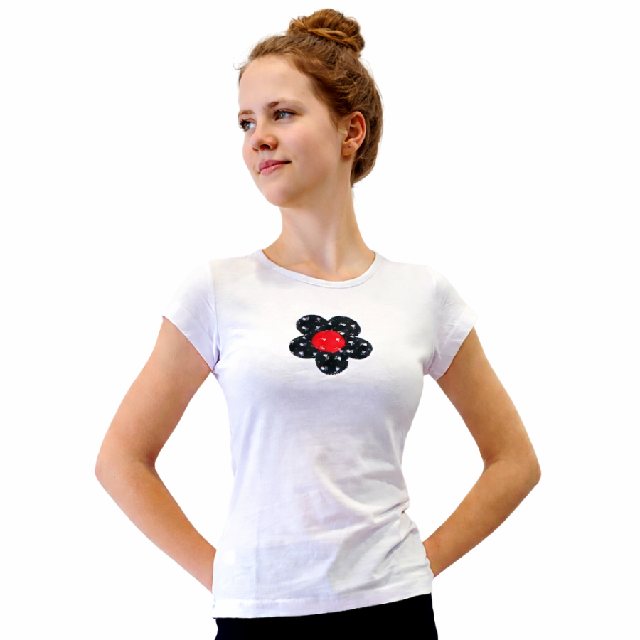 Elegantné dámske tričko s jemnou folklórnou výšivkou je ideálnym spojením tradície a moderného štýlu. Dominantný kvietok dodáva tričku originálny charakter a robí z neho výnimočný kúsok do každého šatníka.
