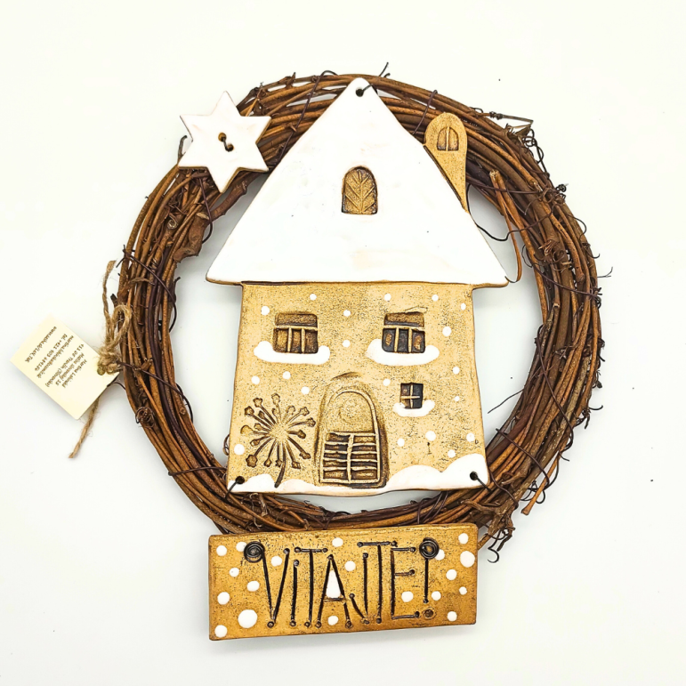Závesný venček dvere s domčekom, kvietkom a tabuľkou Vitajte, sú z ručne modelovanej keramiky, patinovanej a glazovanej, 2 x pálenej, vtáčik je do venčeka pripevnený drôtikom. Venček na zavesenie kdekoľvek ...